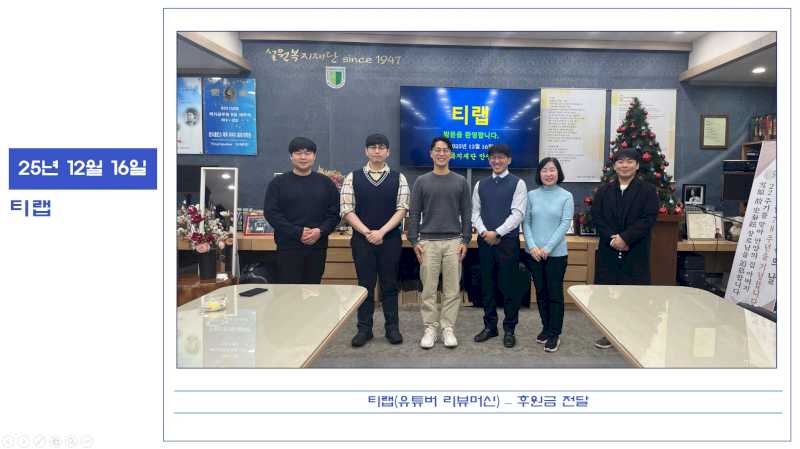 25년 12월 16일 티랩 후원금 전달 페이지 정보 작성자 운영자 댓글 0건 조회 103회 작성일 26-02-10 11:40 본문 티랩(유튜버 리뷰머신)에서 후원금 전달을 해주셨습니다. 감사합니다. 목록 이전글25년 12월 18일 삼천리성탄행사 26.02.10 다음글25년 12월 16일 삼천리 기부금 전달식(유현조 프로) 26.02.02 댓글목록 댓글목록 등록된 댓글이 없습니다.